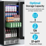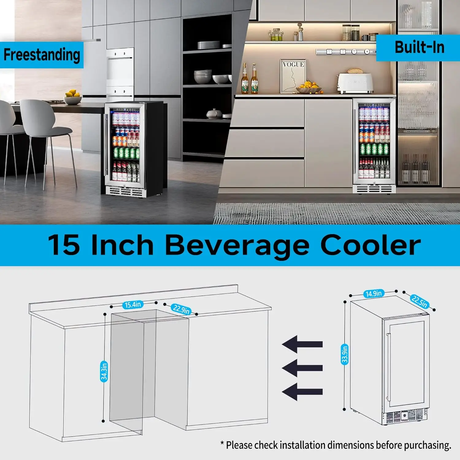 【Optimal Storage Capacity】- 15 inch beverage cooler with 6 adjustable shelves can accommodate up to 126 cans or various wine bottles, allowing flexible storage either upright or horizontally. This mini drink fridge is perfect for keeping your favorite soda, beer, or wine chilled and neatly organized. Whether it's for your kitchen, home bar, living room, or office, enjoy easy access to a variety of beverages always kept at the ideal temperature.