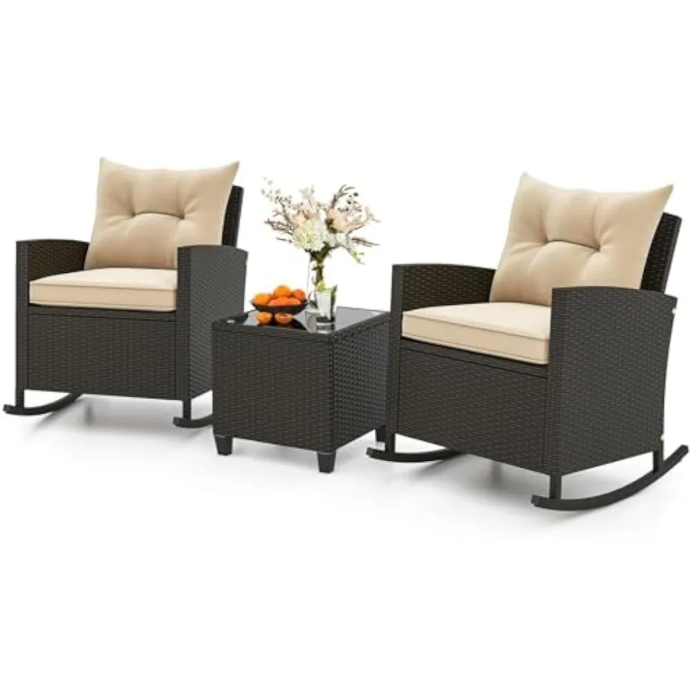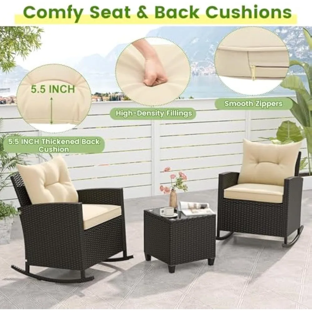 - Handy Side Table: Included in this 3-piece rattan rocking chair set is a convenient square side table, perfect for keeping your necessities and drinks within reach. The elegant tempered glass tabletop is securely held in place by 4 suction cups.