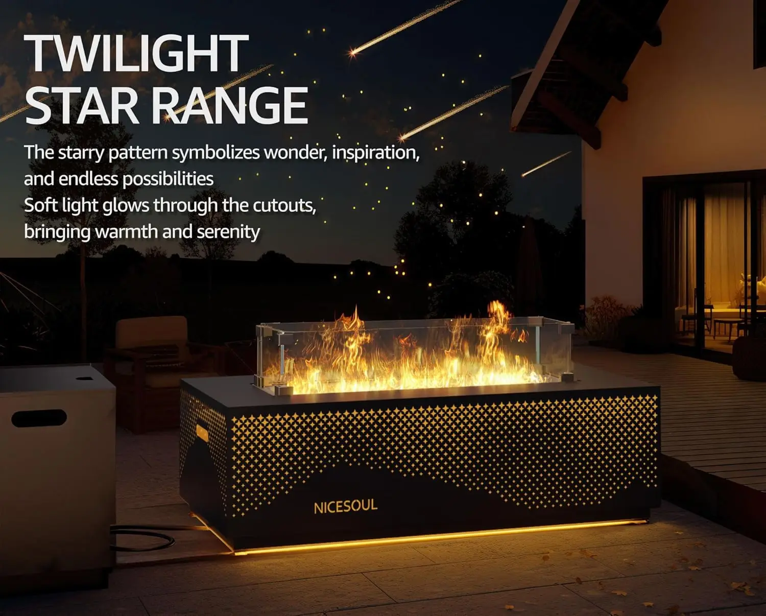 - UNIQUE LED LIGHTS: Inspired by high-end luxury furniture designs, our fire pit table, compatible with a built-in LED light, gently shines through the cutout starry hillside's undulating patterns, representing the natural flow and rhythm of the mountain's terrain, symbolizing harmony and connection with the cosmos; With a simple push of a button, you can easily turn the light on or off, setting the perfect mood for any gathering or relaxing moment, and illuminating your space with warmth and joy