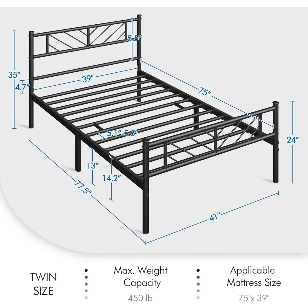 - RELIABLE SUPPORT: This twin size bed frame is built of metal slats, side rails and 6 sturdy legs, with a maximum weight capacity of 450 lb, ensuring a peaceful night's sleep without being bothered by squeaky sounds. 12 built-in metal slats provide optimal support for your mattress and bedding (no box spring required).